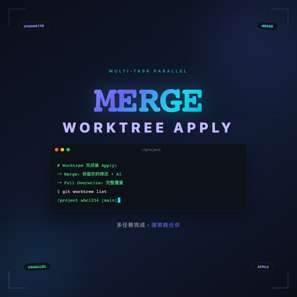 反過來說,這個特性也可以刻意利用:留一點 WIP 在主目錄,開 worktree 做實驗,Apply 時用 merge 只把實驗裡滿意的部分帶回來。