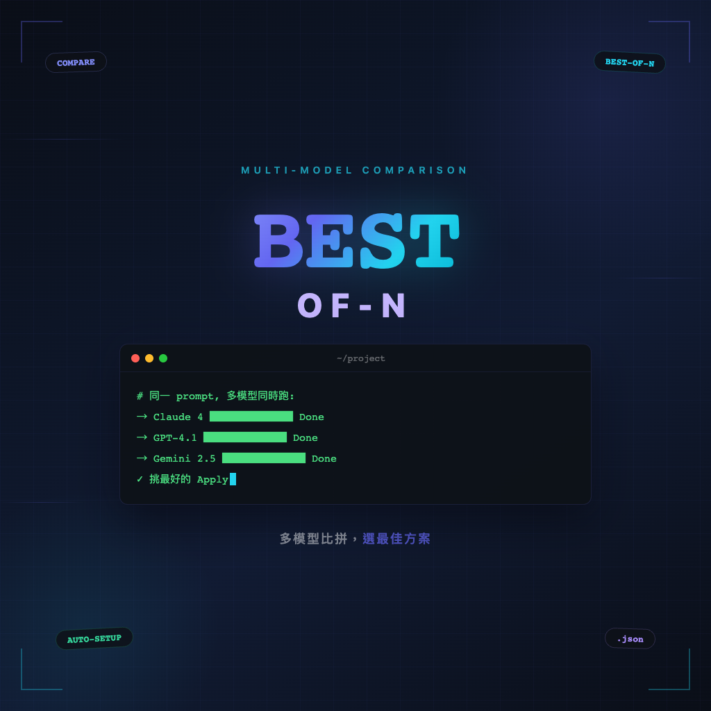 一句話:多個模型同時做同一題,你當評審挑一個。適合難題、想要品質、或對某個模型沒把握的改動。