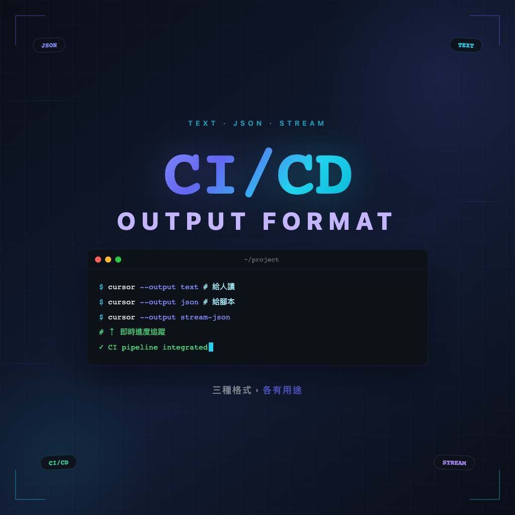 Cursor CLI 輸出格式與 CI 整合:text、json、stream-json 怎麼選